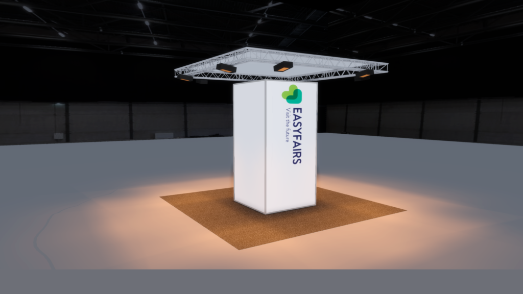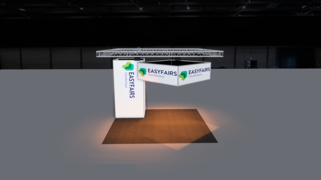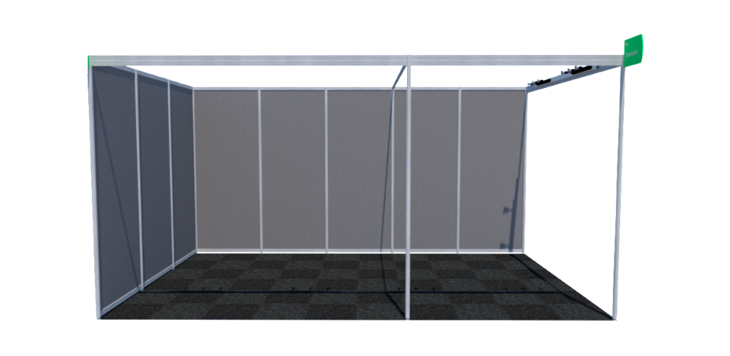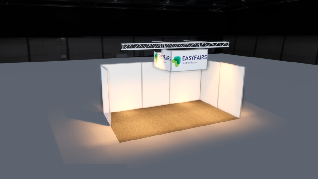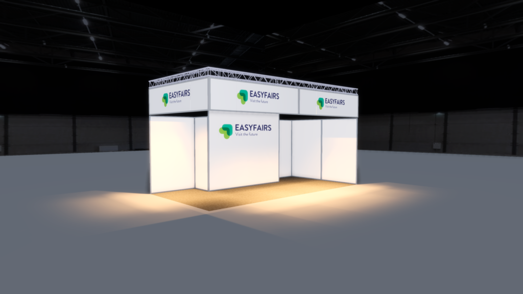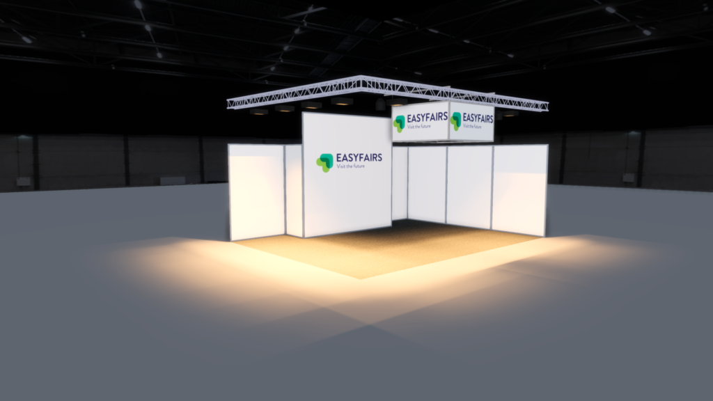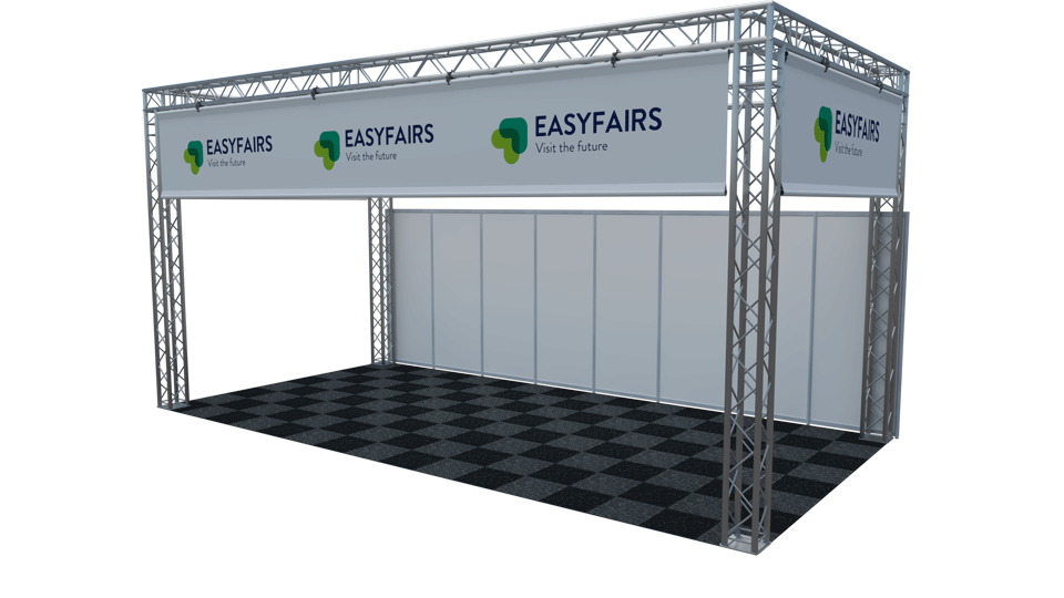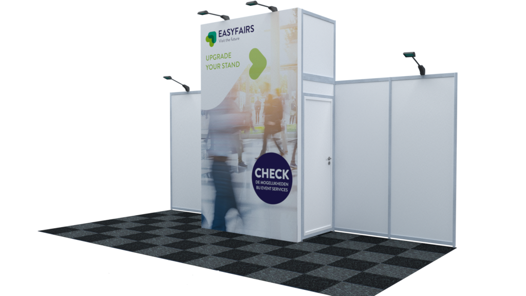 ALL-IN PLUS PAKKET, Truss stand met grijze tapijttegels, een witte achterwand, banieren aan elke open zijde, 1 licht spot per 7m2 en een berging (optioneel)