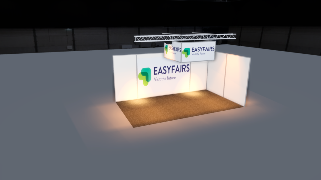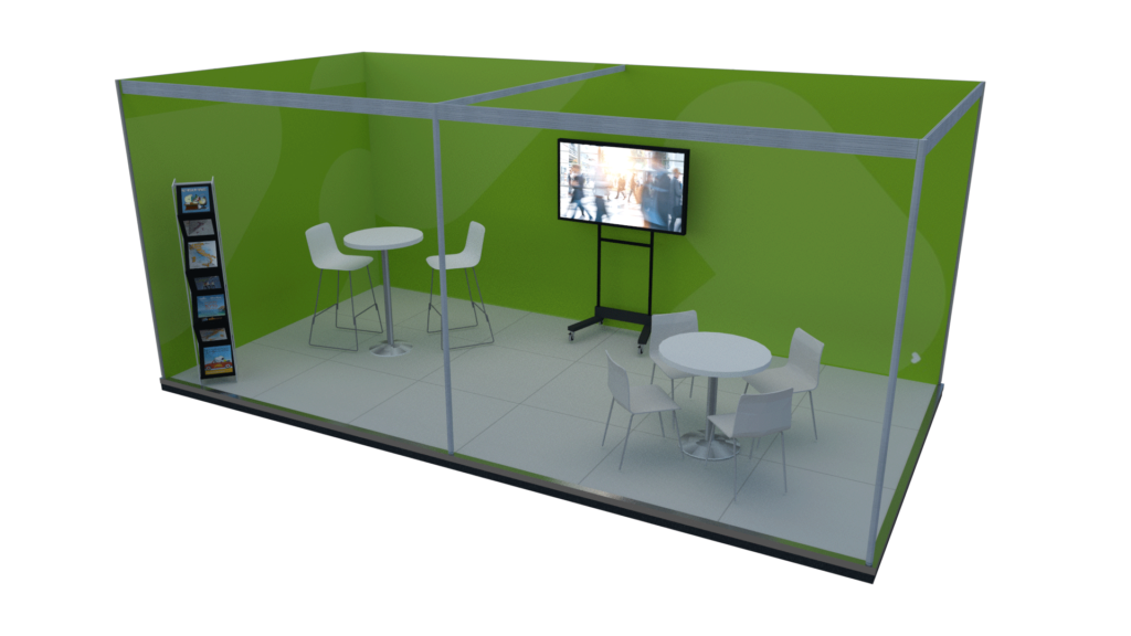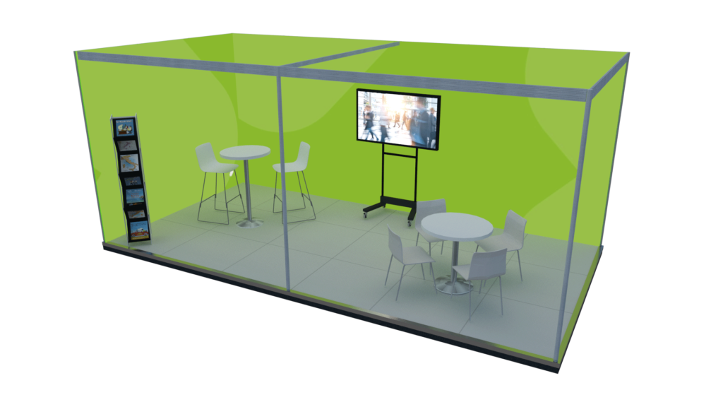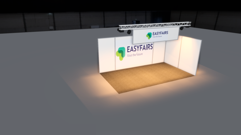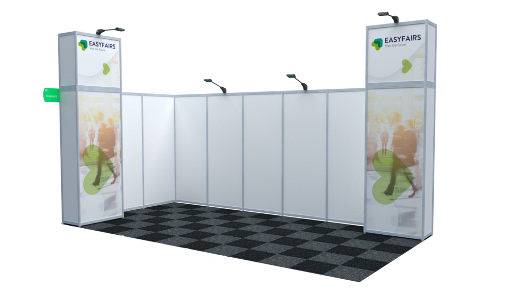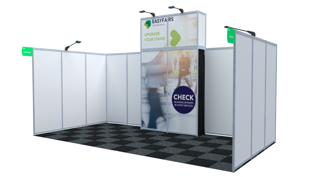 Standbouw 300cm zwart of wit, 1 gepersonaliseerde wand 400cm, berging met gordijn 400 x 100cm, truss met bannerframe aan open zijden 100cm hoog en verlichting.