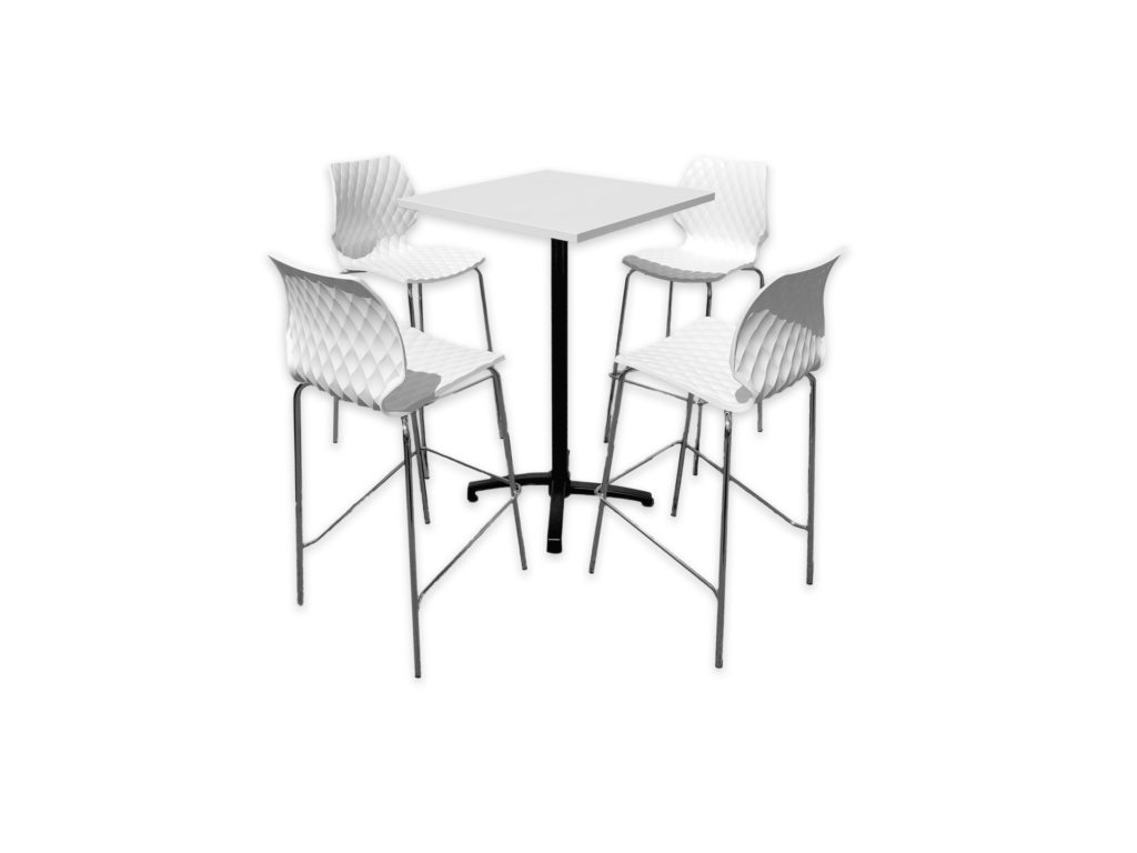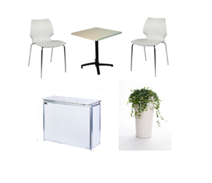 Meubelpakket laag wit: tafel + 2 stoelen, balie en klimop in witte vaas. Ook verkrijgbaar in hoog en/of zwart meubelpakket.