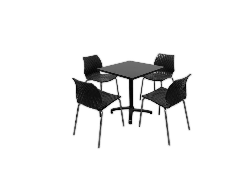 Meubelpakket hoog zwart: tafel + 2 stoelen, balie, vitrinekast en klimop in zwarte vaas. Ook verkrijgbaar in hoog en/of wit meubelpakket.