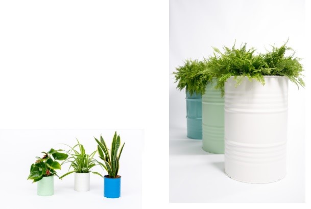 3 kleine metalen blikken met mix van plantjes en 1 olievat met plant.