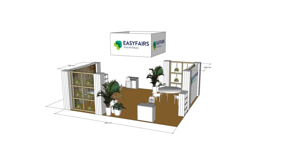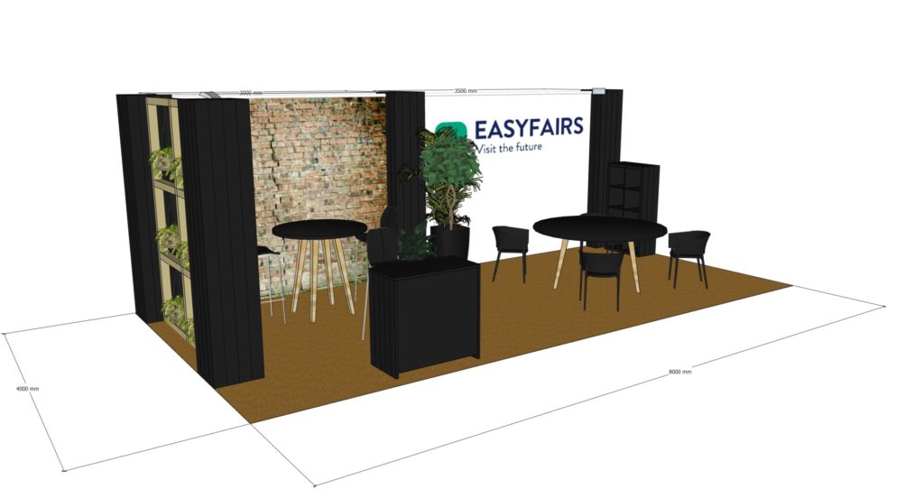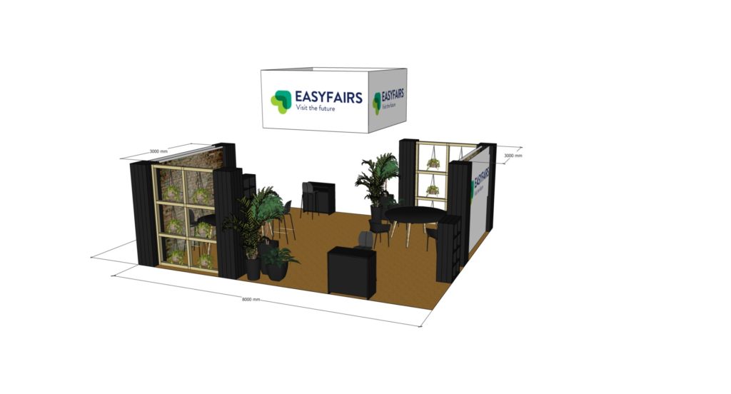 Standbouw 270cm zwart of wit o.b.v. houten kolommen, doek en gepersonaliseerd doek, hoekframe met hangplanten, groendecoratie, verlichting en meubilair afhankelijk van standgrootte.
