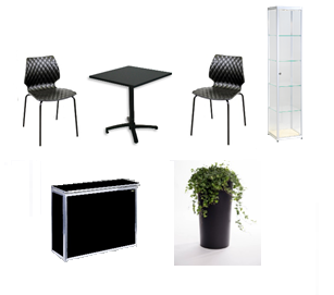 Meubelpakket hoog zwart: statafel + 2 barkrukken, balie, vitrinekast, folderrek, LED scherm 40” op standaard, kader met sanseveria in macramétouwen (260x100cm), kleine metalen blikken met mix van plantjes (20-25x10cm). Ook verkrijgbaar in laag en/of wit meubelpakket.