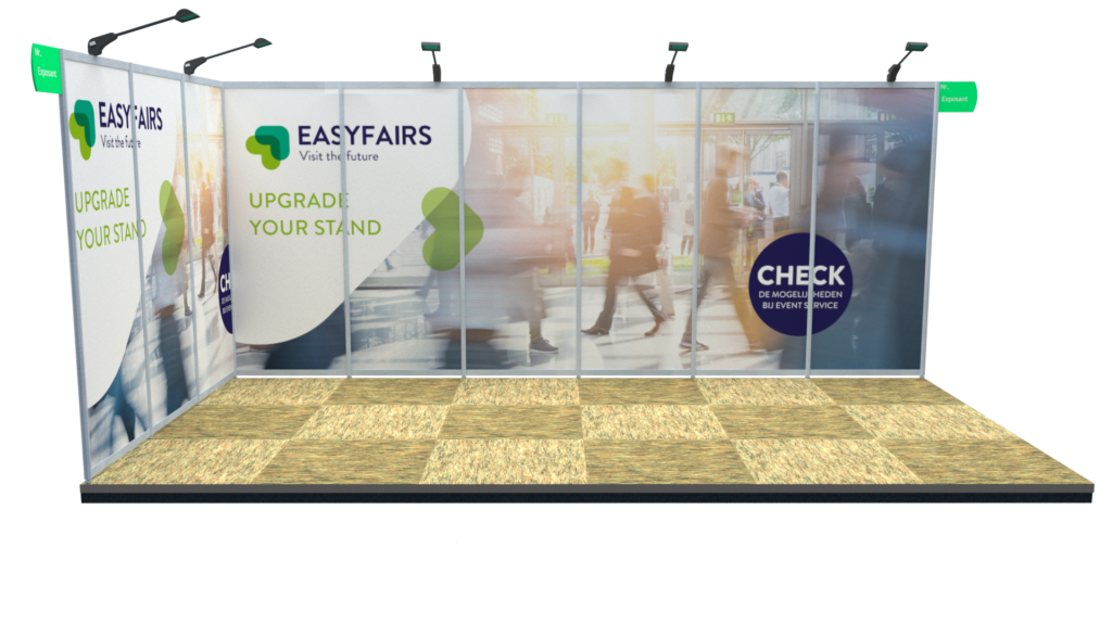All-in pakket, gepersonaliseerde geprinte standpanelen, verhoogde vloer met tapijt (Kasjmier) en pendelspots 1 per 2m print. De standaard frieslijst met spots komt te vervallen.